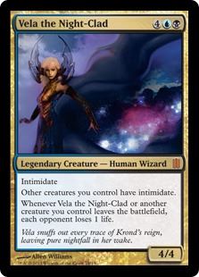 Rules Text: Intimidate (This creature can't be blocked except by artifact creatures and/or creatures that share a color with it.) Other creatures you control have intimidate. Whenever Vela the Night-Clad or another creature you control leaves the battlefield, each opponent loses 1 life.