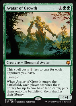 Avatar of Growth ![]() ![]() Creature — Elemental Avatar (4/4) This spell costs less to cast for each opponent you have.Trample When Avatar of Growth enters the battlefield, each player searches their library for up to two basic land cards, puts them onto the battlefield, then shuffles their library. |