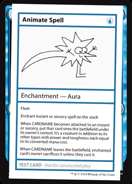 Animate Spell Enchantment — Aura Flash Enchant instant or sorcery spell on the stack When CARDNAME becomes attached to an instant or sorcery, put that card onto the battlefield under its owner's control. It's a creature in addition to its other types with power and toughness each equal to its converted mana cost. When CARDNAME leaves the battlefield, enchanted card's owner sacrifices it unless they cast it. |