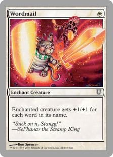 : Choose a word. Target player puts the top card of his or her library into his or her graveyard. If that card has the chosen word in its text box, that player loses 3 life.