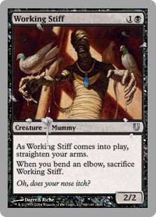 Working Stiff ![]() Creature — Mummy (2/2) As Working Stiff comes into play, straighten your arms. When you bend an elbow, sacrifice Working Stiff. |