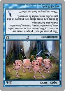 Topsy Turvy ![]() Enchantment The phases of each player's turn are reversed. (The phases are, in reverse order, end, postcombat main, combat, precombat main, and beginning.) If there are more than two players in the game, the turn order is reversed. |