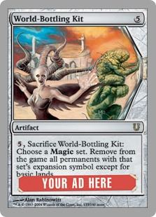 World-Bottling Kit Artifact , Sacrifice World-Bottling Kit: Choose a Magic set. Remove from the game all permanents with that set's expansion symbol except for basic lands. |