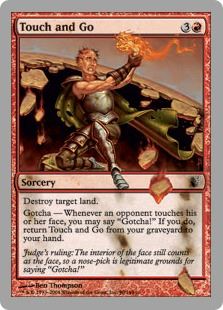 Touch and Go ![]() Sorcery Destroy target land. Gotcha Whenever an opponent touches his or her face, you may say "Gotcha" If you do, return Touch and Go from your graveyard to your hand. |