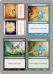 Who/What/When/Where/Why Instant Who ![]() ![]() Instant Target player gains X life. ——- What ![]() ![]() Instant Destroy target artifact. ——- When ![]() ![]() Instant Counter target creature spell. ——- Where ![]() ![]() Instant Destroy target land. ——- Why ![]() ![]() Instant Destroy target enchantment. |
